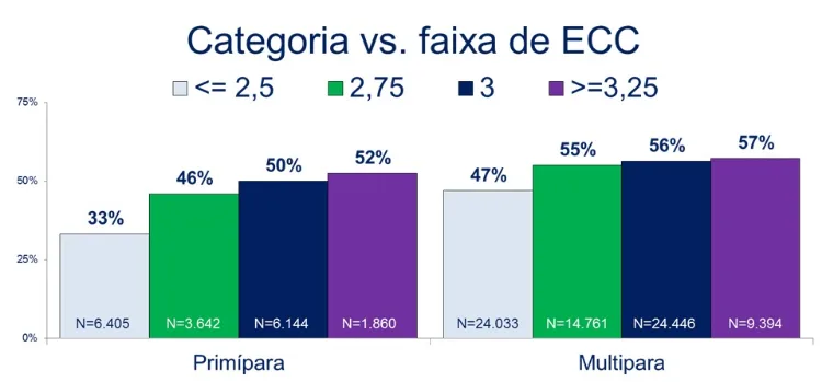 É comum que vacas multíparas — que já tiveram mais um parto — consigam ter resultados melhores de concepção após a IATF, mesmo com uma pequena redução do ECC.