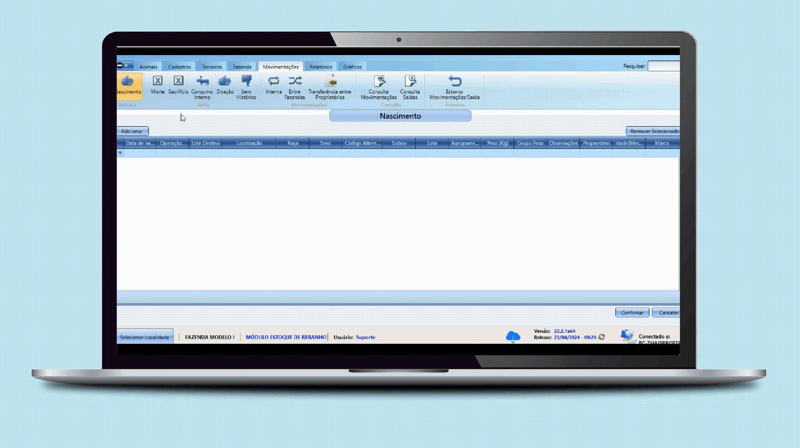 Cadastro de brincos, cota Hilton, emissão de comunicados, importação de base de dados BND, validação de dados a campo.